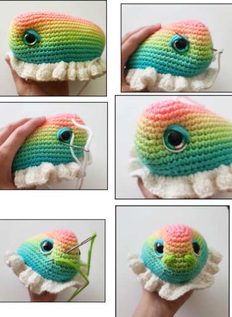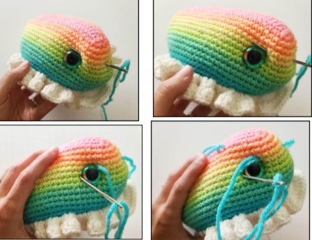 1. For the sleepy eye look: Cut a long strand of blue or teal yarn. Thread your needle and insert into a hole in between the eyes. Bring the needle up to a higher corner on the eye. Bring the needle around the top of the eye and insert the needle into a hole on the side of the eye. Repeat this around 4 more times to create that look. Repeat for the 2nd eye and weave in any yarn tails.